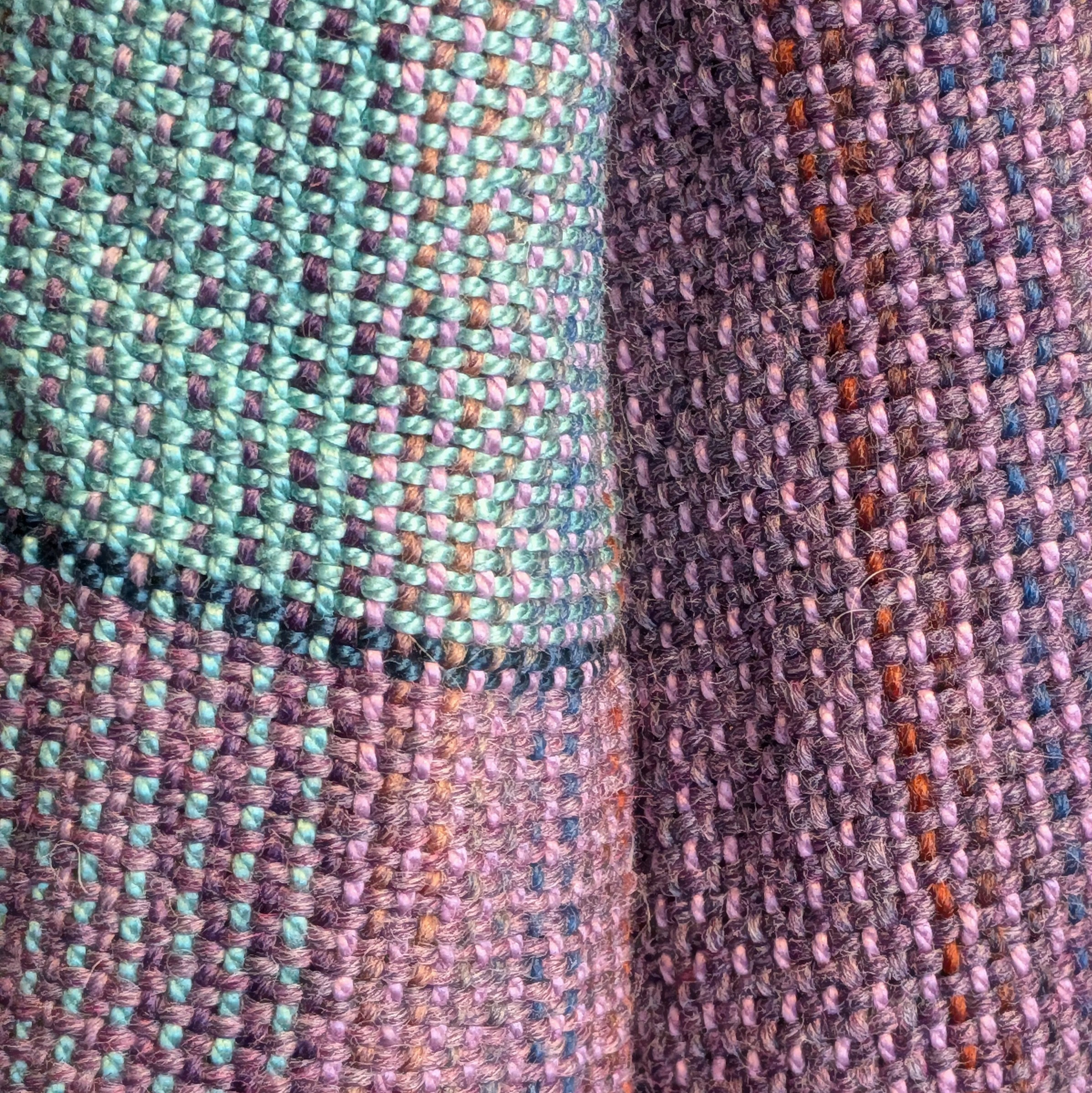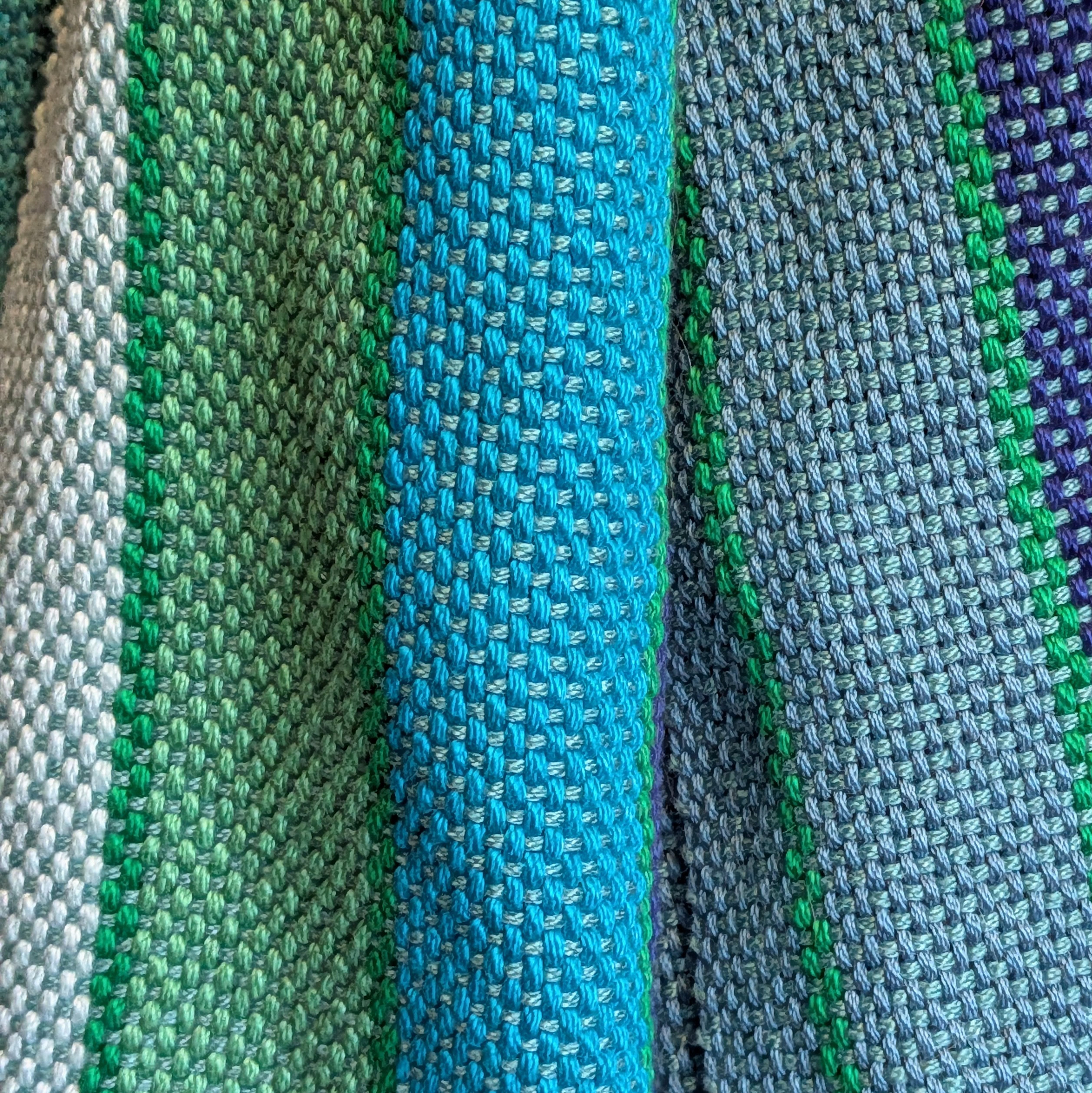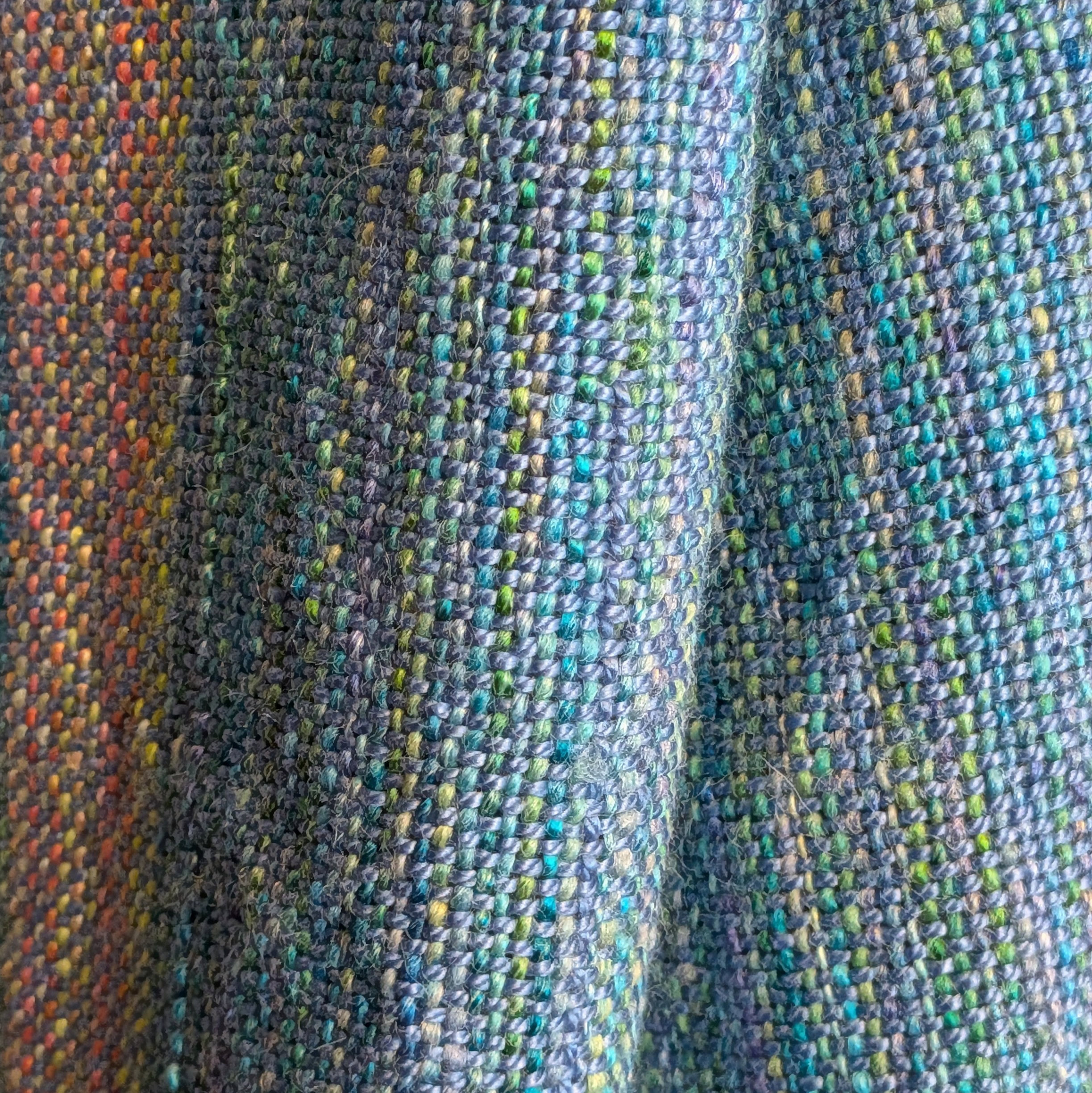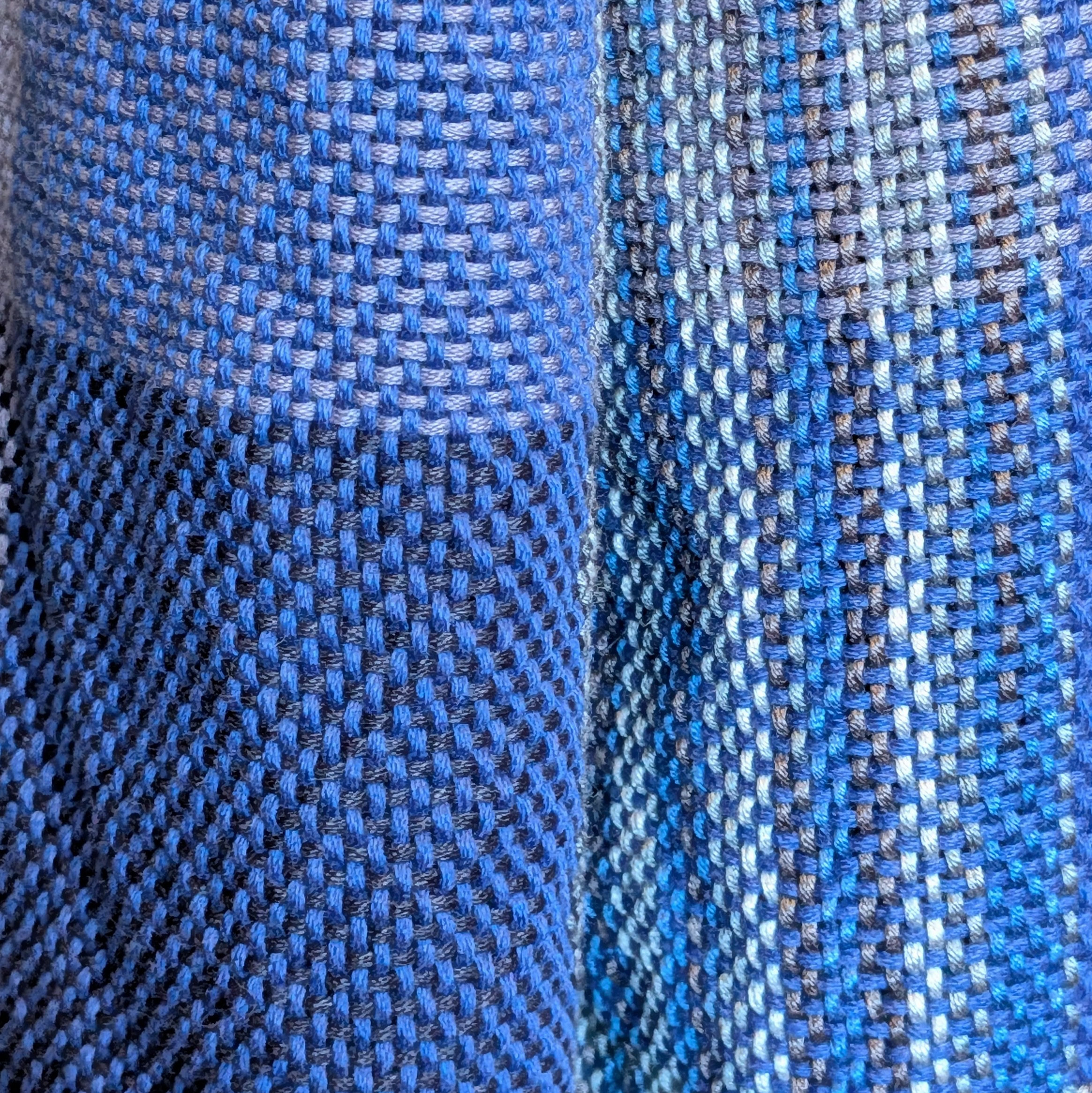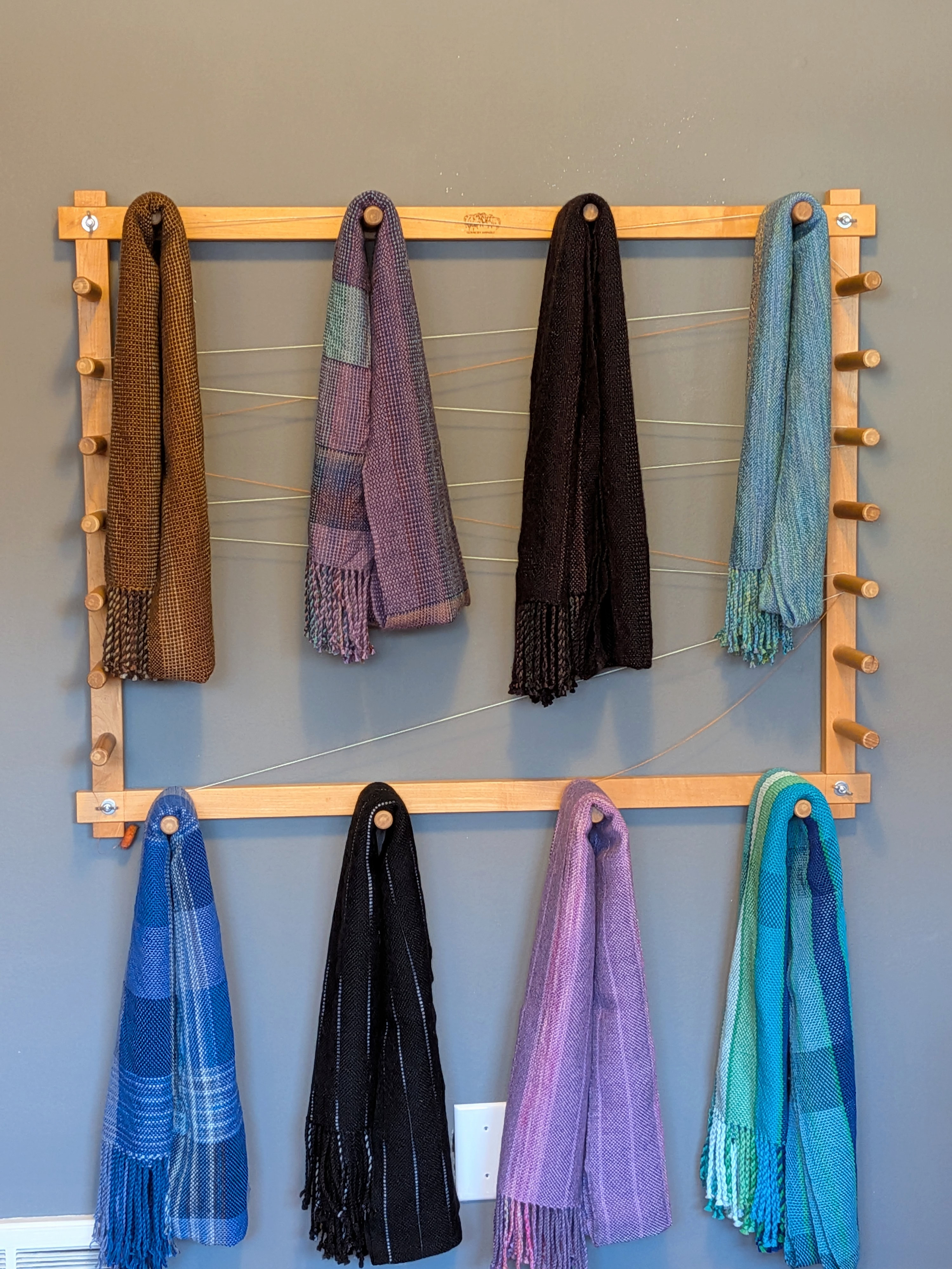 Handwoven scarves, great for a slightly chilly night or an unexpected Zoom meeting. Wool or baby alpaca warps with cotton wefts to have softness, warmth, and sheen.